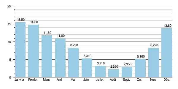 Toujours à cet endroit, le débit instantané maximal enregistré a été de 162 m3/s, le 14 mars 2001.