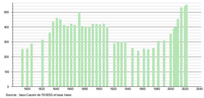 L'évolution du nombre d'habitants est connue à travers les recensements de la population effectués dans la commune depuis 1793. Pour les communes de moins de 10 000 habitants, une enquête de recensement portant sur toute la population est réalisée tous les cinq ans, les populations légales des années intermédiaires étant quant à elles estimées par interpolation ou extrapolation[40]. Pour la commune, le premier recensement exhaustif entrant dans le cadre du nouveau dispositif a été réalisé en 2004[41].