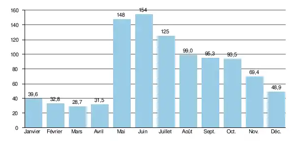 En considérant la seule période libre de glaces (de juin à octobre inclus), le débit mensuel minimal observé a été de 36 m3/s en , ce qui restait assez confortable.