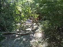 Irene causa également des dommages importants dans les Adirondacks où une section de la route d’État 73 fut emportée par les flots, isolant des hameaux de Keene et St. Huberts du comté d’Essex[122]. Le département de l’environnement de l’État de New York fit savoir que les glissements de terrain étaient trop nombreux pour les compter dans la région des Haut Pics et qu’il devait fermer les parcs Dix et Giant dans la portion est de cette région[123].