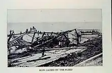 La puissance de l'eau déplaça les édifices de leurs fondations dans Galveston et les vagues les réduisirent en pièces. Plus de 3 600 maisons furent détruites[9] et un mur de débris joncha le Golfe[11]. Les rares bâtiments à survivre, de cossues maisons le long du Strand National Historic Landmark District, sont maintenant l'attraction touristique principale de la ville.
