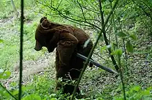 Depuis le XIIe siècle et durant des siècles, en Europe, les montreurs d'ours furent très présents, parcourant les villes et les villages avec des ours dressés à réaliser des tours comme jongler ou faire du vélo[106]. Il semble que ces spectacles aient bénéficié d'une certaine tolérance de la part des autorités chrétiennes, qui par ailleurs s'opposaient à toute mise en scène d'animaux, afin de lutter contre les derniers cultes liés à l'ours et de présenter cet animal sous l'aspect d'une bête domptée et ridicule[107],[108]. De même, après les grands massacres d'ours à l'époque de Charlemagne, la chasse à l'ours fut peu à peu dévalorisée de son statut de chasse royale au profit de la chasse au cerf, plus facile à contrôler et plus « civilisée »[94].