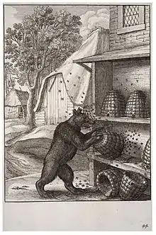 À l'arrivée de la Renaissance, l'ours est de moins en moins mentionné dans les rituels et les traditions d'Europe de l'Ouest et se voit exceptionnellement associé à la sorcellerie et au sabbat[128], un procès de sorcellerie en Lausanne en 1464, où l'accusée avoua avoir « embrassé le cul » d'un ours dans lequel le Diable s'était incarné[129], faisant figure d'exception[128]. Aux XVe et XVIe siècles, un jeu de mots entre dame et ours, donnant « d'amours », devint populaire[130] mais cet animal conserva une mauvaise réputation, symbole de vices et de péchés, de goinfrerie, et même de ruse[131]. Dans les six fables de La Fontaine où l'ours apparaît, c'est toujours sous les traits d'une bête stupide, maladroite et bornée[132].