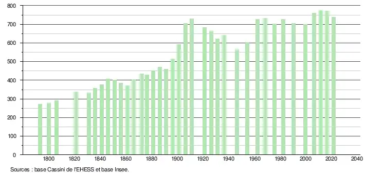 L'évolution du nombre d'habitants est connue à travers les recensements de la population effectués dans la commune depuis 1793. Pour les communes de moins de 10 000 habitants, une enquête de recensement portant sur toute la population est réalisée tous les cinq ans, les populations légales des années intermédiaires étant quant à elles estimées par interpolation ou extrapolation[23]. Pour la commune, le premier recensement exhaustif entrant dans le cadre du nouveau dispositif a été réalisé en 2006[24].