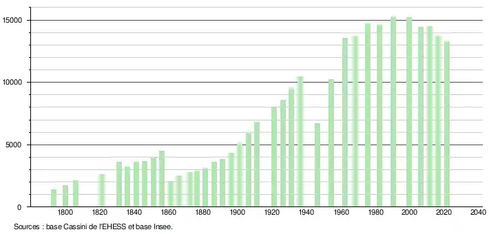 - Par convention dans Wikipédia, le principe a été retenu de n’afficher dans le tableau des recensements et le graphique, pour les populations légales postérieures à 1999, que les populations correspondant à une enquête exhaustive de recensement pour les communes de moins de 10 000 habitants, et que les populations des années 2006, 2011, 2016, etc. pour les communes de plus de 10 000 habitants, ainsi que la dernière population légale publiée par l’Insee pour l'ensemble des communes.