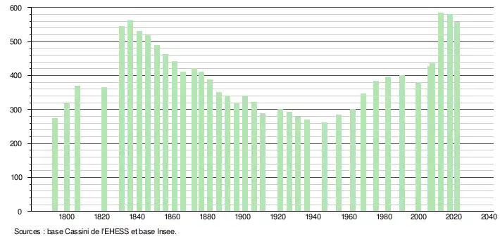 L'évolution du nombre d'habitants est connue à travers les recensements de la population effectués dans la commune depuis 1793. Pour les communes de moins de 10 000 habitants, une enquête de recensement portant sur toute la population est réalisée tous les cinq ans, les populations légales des années intermédiaires étant quant à elles estimées par interpolation ou extrapolation[25]. Pour la commune, le premier recensement exhaustif entrant dans le cadre du nouveau dispositif a été réalisé en 2007[26].