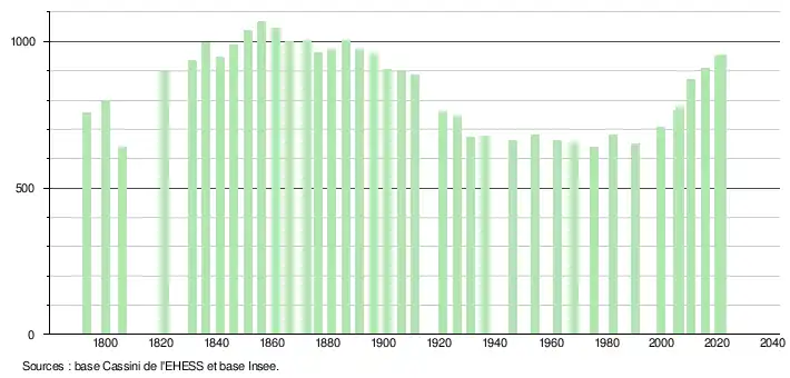 L'évolution du nombre d'habitants est connue à travers les recensements de la population effectués dans la commune depuis 1793. Pour les communes de moins de 10 000 habitants, une enquête de recensement portant sur toute la population est réalisée tous les cinq ans, les populations légales des années intermédiaires étant quant à elles estimées par interpolation ou extrapolation[23]. Pour la commune, le premier recensement exhaustif entrant dans le cadre du nouveau dispositif a été réalisé en 2005[24].