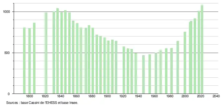 L'évolution du nombre d'habitants est connue à travers les recensements de la population effectués dans la commune depuis 1793. Pour les communes de moins de 10 000 habitants, une enquête de recensement portant sur toute la population est réalisée tous les cinq ans, les populations légales des années intermédiaires étant quant à elles estimées par interpolation ou extrapolation[25]. Pour la commune, le premier recensement exhaustif entrant dans le cadre du nouveau dispositif a été réalisé en 2007[26].