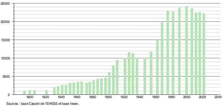 - Par convention dans Wikipédia, le principe a été retenu de n’afficher dans le tableau des recensements et le graphique, pour les populations légales postérieures à 1999, que les populations correspondant à une enquête exhaustive de recensement pour les communes de moins de 10 000 habitants, et que les populations des années 2006, 2011, 2016, etc. pour les communes de plus de 10 000 habitants, ainsi que la dernière population légale publiée par l’Insee pour l'ensemble des communes.