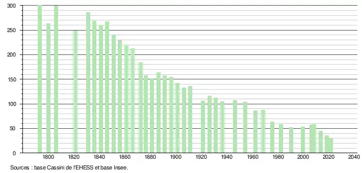 L'évolution du nombre d'habitants est connue à travers les recensements de la population effectués dans la commune depuis 1793. Pour les communes de moins de 10 000 habitants, une enquête de recensement portant sur toute la population est réalisée tous les cinq ans, les populations légales des années intermédiaires étant quant à elles estimées par interpolation ou extrapolation[14]. Pour la commune, le premier recensement exhaustif entrant dans le cadre du nouveau dispositif a été réalisé en 2008[15].