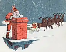 Le , le journal Sentinel de Troy, dans l'État de New York, publie anonymement (mais attribué au professeur américain Clement Clarke Moore ou au major Henry Livingston Junior) le poème A Visit from St. Nicholas dans lequel saint Nicolas est présenté comme un lutin sympathique, dodu et souriant, qui distribue des cadeaux dans les maisons et se déplace sur un traîneau volant tiré par huit rennes nommés respectivement : Fougueux (Dasher), Danseur (Dancer), Fringant (Prancer), Rusé (Vixen), Comète (Comet), Cupidon (Cupid), Tonnerre (Donder) et Éclair (Blitzen)[18]. Ce poème a joué un rôle très important dans l’élaboration du mythe actuel, reprenant les attributs de saint Nicolas (barbe blanche, vêtements rouges et hotte) mais troquant sa mitre, sa crosse et son âne pour un bonnet rouge, un sucre d'orge et un traîneau tout en se débarrassant du père Fouettard[19]. Après le journal Sentinel en 1823, il est repris les années suivantes par plusieurs journaux britanniques et américains (notamment sous l'influence des illustrateurs John Tenniel pour l'hebdomadaire Punch en 1850 et Thomas Nast dans le Harper's Weekly en 1863 qui fixent la figure du père Noël que nous connaissons aujourd'hui, un joyeux vieillard dodu à barbe blanche de 153 à 193 ans, pantalon bouffant retenu par un ceinturon noir et vareuse bordée de fourrure blanche, bonnet rouge et hotte remplie de jouets[20],[18]), puis traduit en plusieurs langues et diffusé dans le monde entier[21].
