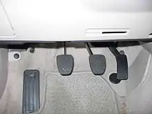 - pour les véhicules à boîte de vitesses manuelle, la pédale d'embrayage commande le couplage/découplage du moteur à la transmission secondaire[1] ;