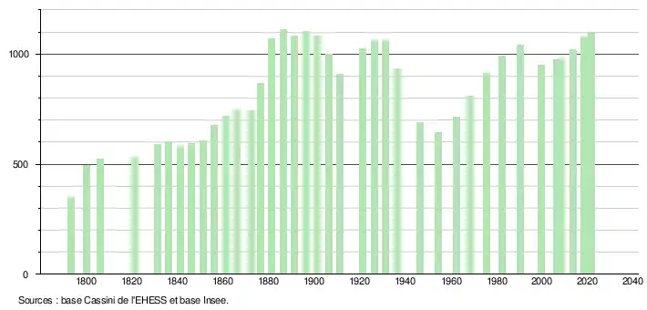 | L'évolution du nombre d'habitants est connue à travers les recensements de la population effectués dans la commune depuis 1793. Pour les communes de moins de 10 000 habitants, une enquête de recensement portant sur toute la population est réalisée tous les cinq ans, les populations légales des années intermédiaires étant quant à elles estimées par interpolation ou extrapolation[24]. Pour la commune, le premier recensement exhaustif entrant dans le cadre du nouveau dispositif a été réalisé en 2008[25]. En 2021, la commune comptait 1 098 habitants[Note 4], en augmentation de 4,87 % par rapport à 2015 (Aude : +2,47 %, France hors Mayotte : +1,84 %). |