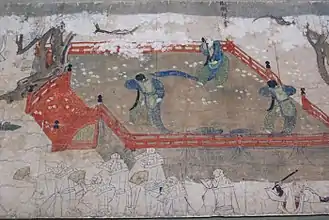 Une remarquable illustration de la vie de la cour impériale et de la haute aristocratie à l'époque du shogunat de Kamakura triomphant se trouve dans les premiers chapitres du Towazugatari, le journal personnel de Dame Nijō (1258-v. 1307). Cette fille d'une grande famille noble fut offerte à son plus jeune âge par son père à l'empereur Go-Fukakusa, dont elle devint par la suite une concubine, avant d'entretenir d'autres liaisons avec des membres de la cour impériale. Cette institution vivait alors dans la résignation devant son déclin politique et la nostalgie de son prestigieux passé (en partie fantasmé), cherchant comme ses aïeules à savourer les plaisirs du vin, de l'amour, de la musique et de la poésie, tentant parfois de reproduire des scènes à la manière du Dit du Genji, vu comme l'illustration par excellence de cet âge d'or révéré. Dame Nijō fut finalement expulsée de la cour en 1283, apparemment en raison de la jalousie de l'impératrice ou de sa liaison avec l'empereur Kameyama, frère et rival de Go-Fukakusa, et formula alors ses vœux bouddhistes, destin courant chez les femmes de l'aristocratie[60],[61]. Dans ce milieu, les femmes étaient éduquées et lettrées, comme le démontre la production littéraire de plusieurs d'entre elles. Elles pouvaient disposer de domaines en propre et exerçaient des fonctions de service (nyōbō) et d'administration (nyōkan) parfois importantes au sein de la cour, ce qui pouvait donc leur donner une certaine influence politique, à l'image de la princesse Shoshi Hachijō-in (1136-1211) qui avait acquis une grande influence et plus de deux cents domaines[62].