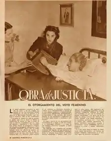- À partir de 1952, avec l'octroi du vote aux femmes, la branche féminine, qui constitue, selon les mots d'Eva Perón, un parti « logiquement lié au mouvement péroniste » mais « indépendant en tant que parti de celui qui intègre les hommes »[5]: le Parti péroniste féminin.