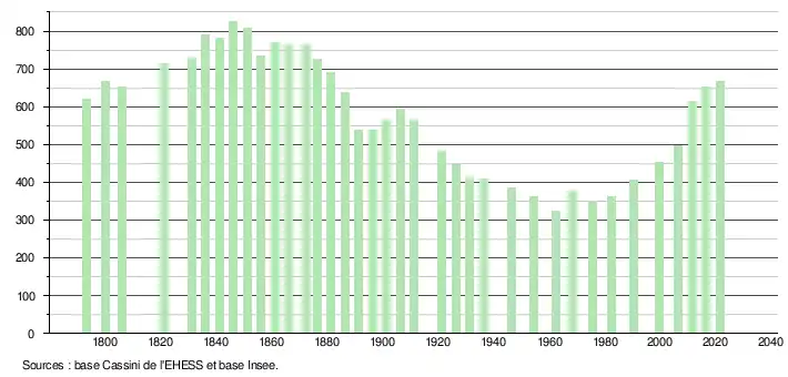 L'évolution du nombre d'habitants est connue à travers les recensements de la population effectués dans la commune depuis 1793. Pour les communes de moins de 10 000 habitants, une enquête de recensement portant sur toute la population est réalisée tous les cinq ans, les populations légales des années intermédiaires étant quant à elles estimées par interpolation ou extrapolation[18]. Pour la commune, le premier recensement exhaustif entrant dans le cadre du nouveau dispositif a été réalisé en 2006[19].