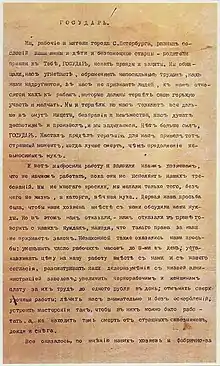 La pétition des travailleurs et des habitants de Saint-Pétersbourg du est un document historique , une pétition ou supplique[1] ,[2], avec laquelle les travailleurs de Saint-Pétersbourg, sous la conduite du prêtre Gueorgui Gapone, se sont rendus chez Nicolas II, le Dimanche rouge, le 9 janvier 1905 ( dans le calendrier grégorien). La pétition a été établie entre le 5 et le par Gueorgui Gapone et un groupe de travailleurs, dirigeants du Collectif des travailleurs russes de Saint-Pétersbourg (désigné ci-après sous le terme Collectif) avec la participation de représentants de l'intelligentsia démocratique[3]. Cette pétition contenait un certain nombre d'exigences, dont certaines d'ordre politique, d'autres d'ordre économique. La principale des exigences était la suppression de la bureaucratie et la convocation de représentants du peuple sous forme d'assemblée constituante sur base d'un vote universel, direct, secret et égalitaire[4]. Les autres exigences de la pétition se répartissaient en trois sortes de mesures : les «mesures contre l'ignorance et le manque de droits du peuple russe», les «mesures contre la pauvreté du peuple» et les «mesures contre l'oppression du capital sur le travail». Le nombre d'exigences s'élevait à dix-sept. Les revendications politiques de la pétition qui proposaient une limitation des pouvoirs de l'autocratie, ont été considérées par le gouvernement comme «audacieuses» ce qui a été la cause de manifestations des travailleurs [5]. La répression est sanglante contre les travailleurs venus porter la pétition, parfois en famille et de manière pacifique. Sur la place du palais d'Hiver, l'armée impériale tire sur la foule. Certains considèrent que cet événement dramatique marque le début de la révolution russe de 1905, pour d'autres, comme Richard Pipes, il s'inscrit dans un mouvement de contestation de la société qui a commencé avec la campagne des banquets de l'Union des Zemstvos en 1904, voire en avec la grève des universités.