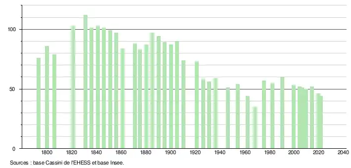 L'évolution du nombre d'habitants est connue à travers les recensements de la population effectués dans la commune depuis 1793. Pour les communes de moins de 10 000 habitants, une enquête de recensement portant sur toute la population est réalisée tous les cinq ans, les populations légales des années intermédiaires étant quant à elles estimées par interpolation ou extrapolation[17]. Pour la commune, le premier recensement exhaustif entrant dans le cadre du nouveau dispositif a été réalisé en 2004[18].