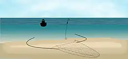 Schéma de fonctionnement d'une senne démersale à la danoise (le dispositif mesure en réalité plusieurs kilomètres).