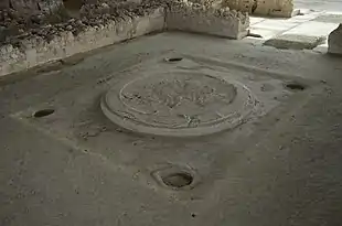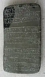 Blegen y trouve également, en plus des vestiges archéologiques du palais, de nombreuses inscriptions en linéaire B, un syllabaire utilisé pour l'écriture de la langue mycénienne entre 1425 et 1200 av. J.-C. Pylos est la plus grande source de ces tablettes en Grèce avec 1 087 fragments trouvés sur le site du palais de Nestor. À la suite de son déchiffrement en 1952 par Michael Ventris et John Chadwick, le mycénien se révèle être une forme archaïque du grec, le plus ancien dialecte grec connu, dont certains éléments ont survécu dans la langue d'Homère grâce à une longue tradition orale de poésie épique[11],[12]. Ainsi, ces tablettes en argile, généralement utilisées à des fins administratives ou d'enregistrement des transactions économiques, démontrent clairement que le site était déjà appelé « Pylos » en grec mycénien : ![]()