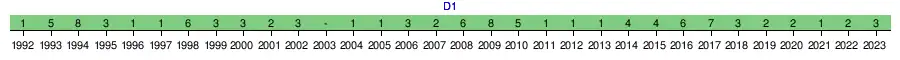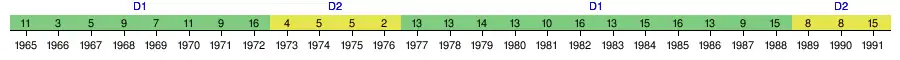 | 1992 | 1re | 1er | 62 | 36 | 30 | 2 | 4 | 104 | 23 | +81 | Quarts de finale | |