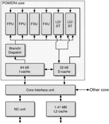 L'unité interne du POWER4 consiste en deux implémentations de l'architecture PowerPC-AS. Le POWER4 a deux caches de niveau 2 unifiés, divisés en trois parties égales. Chacun d'eux à son propre contrôleur de cache de niveau 2 indépendant qui peut chercher 32 octets de données par cycle. La Core Interface Unit (CIU, unité d'interface principale), connecte chaque contrôleur de cache au cache de données ou au cache d'instructions des deux processeurs. L'unité Non-Cacheable (NC), s'occupe de la gestion de la sérialisation des instructions et de toutes les opérations qui ne sont pas cachables dans la topologie des enregistrements. Il y a un contrôleur de cache de niveau 3, mais il est situé en fait en dehors de la puce. Le contrôleur de bus GX pilote les entrées/sorties, les communications, et les deux bus GX 32bits, un en entrée et l'autre en sortie. Le Fabric Controller est le contrôleur principal du réseau de bus, des communications entre les contrôleurs de caches, des communications entre les puces POWER4, et des modules de POWER. Le processeur contient aussi le nécessaire au débogage (Built In Self Test function, BIST) et à la mesure de performances avec la Performance Monitoring Unit (PMU). Le Power-on reset est aussi supporté.
