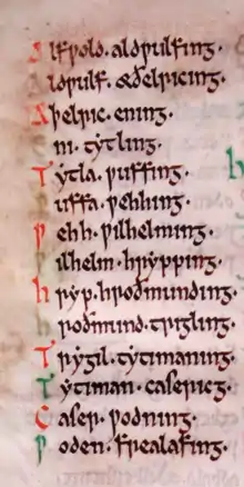 Une troisième divinité est Tiw, l'équivalent du Týr de la mythologie nordique. Il pourrait s'agir d'une divinité guerrière, bien que dans le poème runique anglo-saxon, la rune tir (ᛏ) soit associée à l'étoile polaire plutôt qu'à un dieu[54]. Lorsque cette rune apparaît sur des armes ou des urnes crématoires, ce pourrait être en référence à Tiw[61]. Son nom est attesté dans des toponymes comme Tuesley (« le bois ou la clairière de Tiw ») dans le Surrey, Tysoe (« la colline de Tiw ») dans le Warwickshire ou Tyesmere (« l'étang de Tiw ») dans le Worcestershire[44],[56],[62],[61].