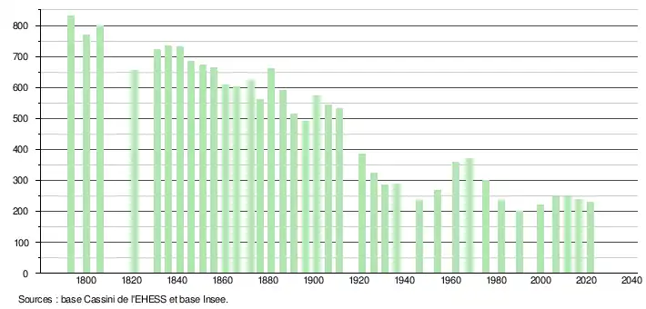 L'évolution du nombre d'habitants est connue à travers les recensements de la population effectués dans la commune depuis 1793. Pour les communes de moins de 10 000 habitants, une enquête de recensement portant sur toute la population est réalisée tous les cinq ans, les populations légales des années intermédiaires étant quant à elles estimées par interpolation ou extrapolation[16]. Pour la commune, le premier recensement exhaustif entrant dans le cadre du nouveau dispositif a été réalisé en 2006[17].