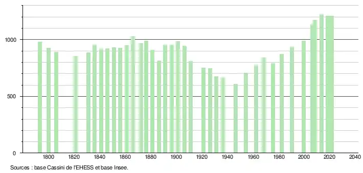 | L'évolution du nombre d'habitants est connue à travers les recensements de la population effectués dans la commune depuis 1793. Pour les communes de moins de 10 000 habitants, une enquête de recensement portant sur toute la population est réalisée tous les cinq ans, les populations légales des années intermédiaires étant quant à elles estimées par interpolation ou extrapolation[29]. Pour la commune, le premier recensement exhaustif entrant dans le cadre du nouveau dispositif a été réalisé en 2008[30]. En 2021, la commune comptait 1 207 habitants[Note 4], en diminution de 1,15 % par rapport à 2015 (Gironde : +6,88 %, France hors Mayotte : +1,84 %). |