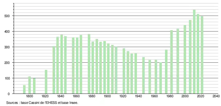 L'évolution du nombre d'habitants est connue à travers les recensements de la population effectués dans la commune depuis 1793. Pour les communes de moins de 10 000 habitants, une enquête de recensement portant sur toute la population est réalisée tous les cinq ans, les populations légales des années intermédiaires étant quant à elles estimées par interpolation ou extrapolation[24]. Pour la commune, le premier recensement exhaustif entrant dans le cadre du nouveau dispositif a été réalisé en 2006[25].