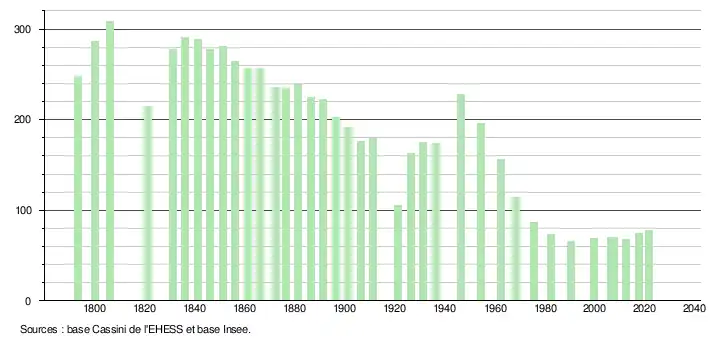 L'évolution du nombre d'habitants est connue à travers les recensements de la population effectués dans la commune depuis 1793. Pour les communes de moins de 10 000 habitants, une enquête de recensement portant sur toute la population est réalisée tous les cinq ans, les populations légales des années intermédiaires étant quant à elles estimées par interpolation ou extrapolation[20]. Pour la commune, le premier recensement exhaustif entrant dans le cadre du nouveau dispositif a été réalisé en 2007[21].