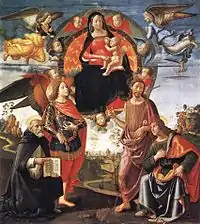 « Il réalisa à la détrempe le retable, bien isolé du reste, avec des figures disposées en six compartiments autour de Notre-Dame trônant dans les air, l'Enfant dans les bras. Parmi les saints qui l'entourent, saint Laurent et saint Étienne sont tout à fait vivants ; à saint Vincent et saint Pierre martyr , il ne manque que la parole. Ce panneau est en partie inachevé, à cause de la mort du peintre ; mais il avait tant avancé son travail qu'il ne restait plus qu'à finir certaines figures du verso, où se trouve la Résurrection du Christ et trois figures dans les compartiments. L'ensemble fut achevé plus tard par Benedetto et David Ghirlandaio, ses frères. »