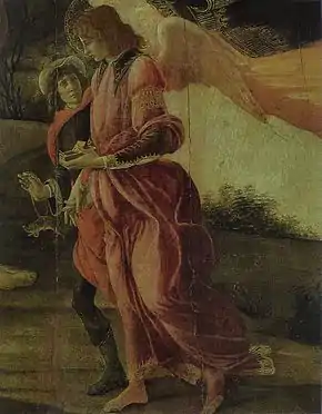 En bas de la composition, en dimensions réduites et inhabituelles se trouve l'archange Raphaël accompagnant Tobie, qui tient à la main le traditionnel poisson que l'ange lui a fait pêcher afin de sauver son père malade Tobias. L'archange est invoqué comme saint protecteur de l'arte dei Medici e degli Speziali.