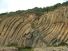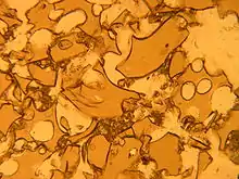 La palagonite peut aussi se former par météorisation lente de la lave, résultant en une fine couche jaune-orangé à la surface de la roche.