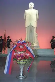 Les corps embaumés de l'ancien président et de son fils y sont exposés à l'intérieur d'un sarcophage en verre clair. Leur tête repose sur un oreiller de style coréen et ils sont couverts par le drapeau du Parti du travail de Corée.