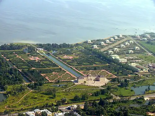 En 1714, sur un terrain accueillant auparavant une ambassade suédoise, Pierre le Grand décide d'implanter sa nouvelle résidence d'été. Jean-Baptiste Alexandre Le Blond, célèbre pour sa collaboration avec Le Nôtre à Versailles, est chargé d'établir les plans du palais et des jardins. Le Blond imagine un palais sur une île, entouré d'eau, mais les ébauches des jardins sont abandonnées à la mort de l'architecte en 1719.