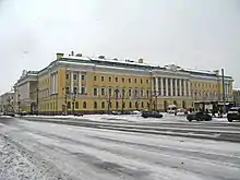L'entrée principale, sur la perspective de l'Amirauté, a un portique à huit colonnes faisant face au bâtiment de l'Amirauté, et son porche est gardé par des lions Médicis en marbre blanc du sculpteur Paolo Triscorni sur des socles en granit[1],[3]. Les sculptures de Triscorni ont été rendues célèbres par Pouchkine dans son dernier long poème, Le Cavalier de bronze[4].