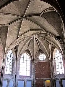 Les parties restantes de l'édifice, escalier d'honneur, chapelle et salle des gardes, sont de style gothique tardif : fenêtres à meneaux, tourelle octogonale abritant un escalier à révolution, salle des gardes voûtée d'ogives élancées, chapelle (dite salle du Conclave).