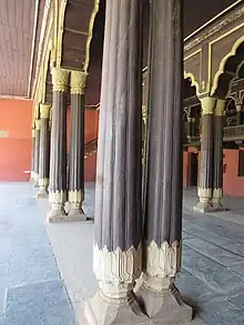 Les massifs double piliers en bois de teck supportent d'énormes poutres du même bois sombre grâce à des consoles et des arcs polylobés finement sculptés et peints en deux couleurs dans le style indo-islamique. La base de chaque pilier est ornée d'un motif sculpté de telle façon qu'il semble que le pilier émerge d'une fleur. Les murs et le plafond du palais sont également ornés de beaux motifs floraux.