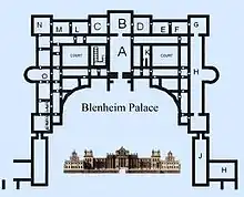 Le plan du corps de logis est un rectangle percé de deux cours qui ne servent guère plus que de puits de lumière. Les principales salles d'apparat se trouvent derrière la façade sud ; les appartements privés du duc et de la duchesse se trouvent à l'est ; à l'ouest sur toute la longueur de l'étage noble se trouve une longue galerie conçue à l'origine comme une galerie de tableaux, mais qui est maintenant la bibliothèque. Le corps de logis est reliée à deux ailes de fonction s’articulant autour de cours carrées. Les cuisines, la buanderie et d'autres pièces à usage domestique s'ouvrent sur la cour est ; la cour ouest est adjacente à la chapelle, aux écuries et au manège couvert. Ces trois ensembles délimitent la « Great Court » (« Grande Cour ») destinée à impressionner le visiteur arrivant au palais. Les pilastres et les piliers abondent, tandis que des toits, ressemblant eux-mêmes à ceux d'une petite ville ; de grandes statues à la manière Renaissance de la basilique Saint-Pierre de Rome regardent le visiteur d'en haut, pour lui faire prendre conscience de son inconsistance. D'autres statues assorties, en guise de trophées martiaux, ornent les toits, notamment Britannia debout au sommet du fronton d'entrée devant deux captifs français enchaînés et couchés sculptés dans le style de Michel-Ange[35] et le lion anglais dévorant le coq français, sur le toits inférieurs. Beaucoup d'entre eux sont par de maîtres tels que Grinling Gibbons[36].