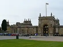 Il existe deux approches de la grande entrée du palais, l'une depuis la longue allée droite à travers des portes en fer forgé, directement dans la Grande Cour; l'autre, tout aussi sinon plus impressionnant, trahit la véritable vision de Vanbrugh : le palais comme bastion ou citadelle, véritable monument et demeure d'un grand guerrier. La grande porte est, un arc de triomphe monumental, de conception plus égyptienne que romaine, perce le mur-rideau urbain sans fenêtre. Une illusion d'optique a été créée en effilant ses murs pour créer une impression de hauteur encore plus grande. Confondant ceux qui accusent Vanbrugh d'impraticabilité, cette porte est aussi le château d'eau du palais. Par l'arche de la porte, on aperçoit à travers la cour une seconde porte également massive, celle sous la tour de l'horloge à travers laquelle on entrevoit la Grande Cour[39].