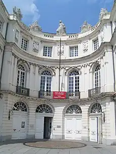 C’est l’entrée semi-circulaire, placée dans l’axe de l’actuelle rue du Musée, qui donne aux constructions commanditées par Charles Alexandre de Lorraine leur distinction et leur beauté. La réalisation de cette entrée démontre l’ingéniosité de l’architecte.