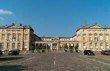 - Pour le dénivelé, l'architecte n'a pourvu la façade sur le parc que de deux niveaux (un rez-de-chaussée et un étage), mais, depuis le jardin, il a donné une impression d'exhaussement de ce long bâtiment bas en construisant un mur de terrasse[24]. Toutes les autres façades du bâtiment ont trois niveaux (rez-de-chaussée, étage, attique)[25], le rez-de-chaussée de la façade sur le jardin correspondant au premier étage du reste du bâtiment), tandis que l'étage de cette façade correspond à l'attique. Mais ce changement de niveau est totalement insensible car on ne voit jamais simultanément la partie à deux niveaux et celle à trois niveaux sauf à l'angle de la place d'Armes, où la différence est corrigée par la terrasse.