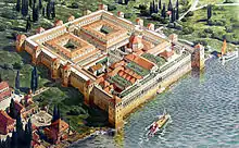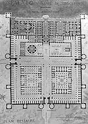 Avec ses caractéristiques empruntant à la fois à l'architecture militaire, urbaine et résidentielle rurale, c'est en fait, pour reprendre l'expression de N. Duval, l'équivalent d'un château moderne[43]. Le terme évoque en français un complexe monumental associant une résidence d'apparat et ses dépendances, une architecture monumentale, et souvent une enceinte fortifiée. Mais de même que l'abdication volontaire de Dioclétien était un fait presque inouï de l'histoire impériale romaine, la résidence prévue pour sa retraite demeura un édifice sans véritable équivalent après la Tétrarchie.