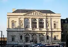 De style néoclassique, il présente une façade ordonnée, d'ordre dorique au premier niveau, ionique au second. Au fronton, la loi est appuyée sur la Justice, entourée de quatre autres allégories, figurant le Commerce, l'Industrie, l'Artisanat et les Arts, réalisation du sculpteur Louis-Victor Bougron[3]. Les grandes niches du premier étage abritent des statues de Charlemagne et de Napoléon[1], du même sculpteur.