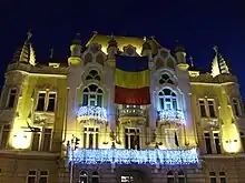 Le bâtiment est construit en style art nouveau avec des éléments d'inspiration gothique et renaissance.