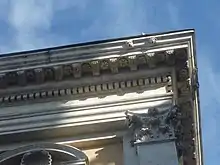 Della Porta termine la façade à son idée : il est l'auteur des chapiteaux et de l'entablement du grand ordre des pilastres[5] ; il perce la fenêtre protobaroque centrale, sans doute prévue pour être de même taille que les autres, et place au-dessus de l'énorme ouverture un fronton triangulaire serré entre les pilastres l'encadrant[8], rompant ainsi la régularité des travées, ce qui était contraire aux intentions de Michel-Ange[5].