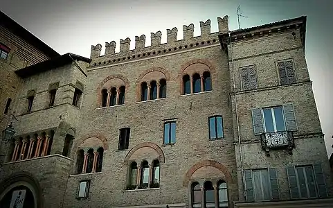 Le palais a été construit entre 1221 et 1240 sur le côté sud de la « Platea Communis » (aujourd'hui Piazza Garibaldi), à l'est de l'actuelle rue Farini, reliée par un « balatorium » au palais Torello (disparu), l'ancien siège de la municipalité jusqu'en 1221[1]. Le bâtiment servait de résidence au podestat, qui jusque-là n'avait pas de résidence permanente dans la ville[2].