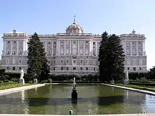 Il est également connu sous le nom de palais d'Orient (Palacio de Oriente), bien qu'il soit situé dans la partie la plus occidentale de Madrid, en raison de son emplacement sur la place de l'Orient (Plaza de Oriente) elle-même étant situé à l'est du palais. Le Théâtre royal ayant un axe direct avec le palais.
