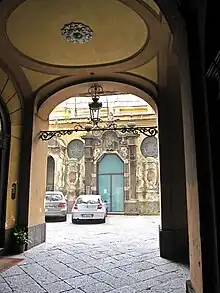 On remarque des restes de l'édifice baroque napolitain dans la cour intérieure. Un édifice bas divise au fond le palais avec la propriété située à l'arrière. Ce petit édifice est caractérisé par un portail avec un fronton cintré terminé par un buste au centre, flanqué de « pignatte » (vases surmontés d'une pigne) angulaires à la fin des volutes. Le passage est formé d'un arc polygonal en marbre et piperno. À l'extrémité de l'arc se trouvent deux reliefs figurant des chevaux rampants avec la devise DONEC AD METAM[2]. Deux ouvertures mineures arquées se trouvent de côté avec un tympan semi-circulaire brisé, dont le milieu avait dû autrefois accueillir d'autres bustes.